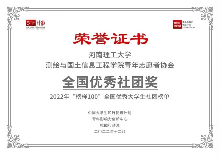 “榜样100”全国优秀大学生社团榜单由中国大学生知行促进计划、青年影响力创新中心、校园行动派联合发布,自2019年起每年发布一次。测绘青协在此次评选中被评选为优秀社团,是微扑克下载