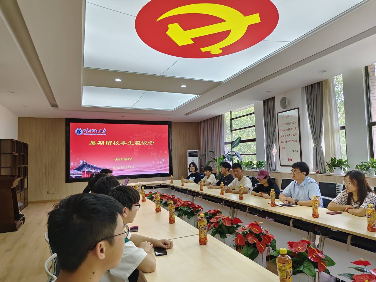 在二楼会议室召开暑期留校学生座谈会,参加座谈会的有留校学生代表和暑期临时党支部党员代表,会议由学工办主任丰习才主持。