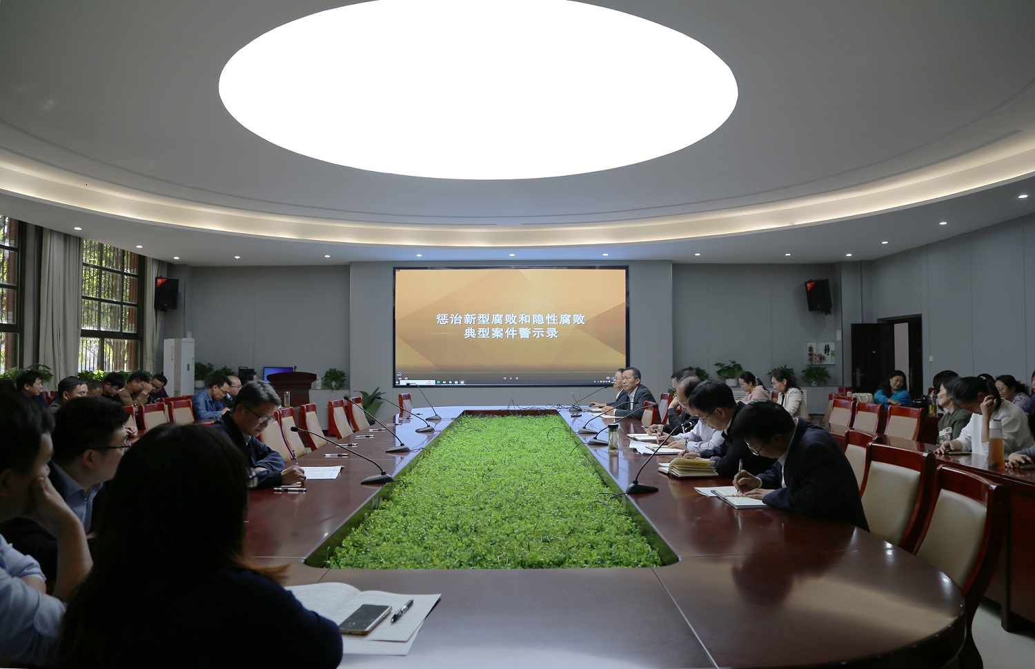 党委组织全体教职工在一楼会议室观看《惩治新型腐败和隐形腐败典型案件警示录》警示教育片。
