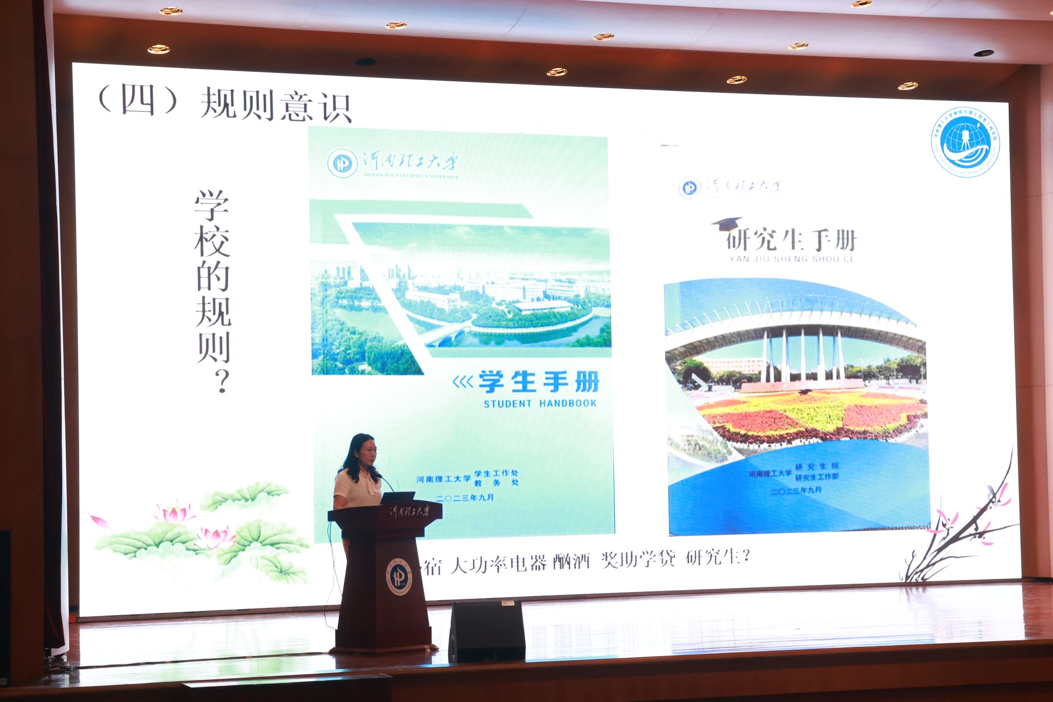 近三年因学分为问题而达到退学或退学警告的学生数据为例,鼓励新生要牢记学习第一要务,珍惜大学时光,努力学习专业知识。她强调只有掌握扎实的专业知识,才能为未来的职业发展打下坚实的基础。三是牢记规矩意识,“没有规矩不成方圆”,她提醒新生要对规矩怀有敬畏之心。她说无论是“老虎吃人”的教训,还是学生手册、研究生手册的规定,都要求新生严格遵守校规校纪,做一个讲规则,守规矩的好学生。