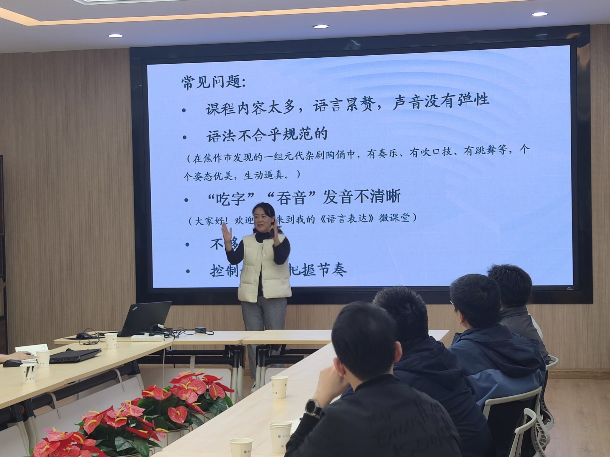 姜楠教授在讲座中,针对理工科教师在发声上普遍存在的音量不足、语速过快等问题,进行了全面而深入的剖析。她结合教学竞赛中的现场汇报实例,给出了切实可行的改进建议,并强调了科学发声对于提升教学效果的重要性。在现场,姜教授还亲自示范指导了正确的发声技巧和练习方法,让教师们直观地感受到了声音的魅力与变化。