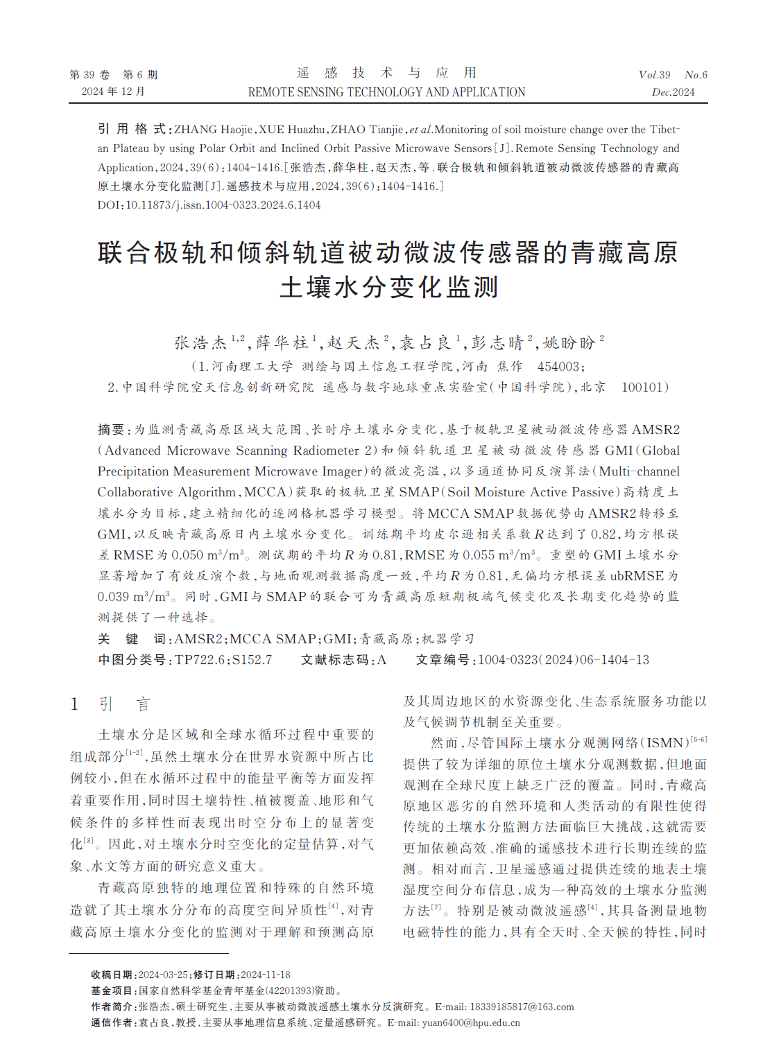 2021级测绘科学与技术硕士生张浩杰以第一作者身份在CSCD核心期刊《遥感技术与应用》(2024年第6期)发表题为《联合极轨和倾斜轨道被动微波传感器的青藏高原土壤水分变化监测》封面论文。论文通信作者为微扑克app