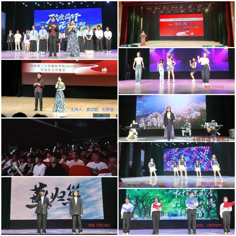 三尺讲台育桃李,舞台之上见真情。张健雄老师一曲《当我们相聚的时候》,唱出三十年执教的师生情谊;傅建春老师朗诵《沁园春·测绘》,尽显测绘人壮志豪情;肖东洋老师以《七律·贺测绘学子毕业》,送上真挚毕业赠言。朗诵与歌舞《诗韵毕业情,欢歌向未来》,将诗意与歌舞融合,为青春写下浪漫注脚。当《我们的明天》的旋律缓缓响起,晚会落下帷幕。