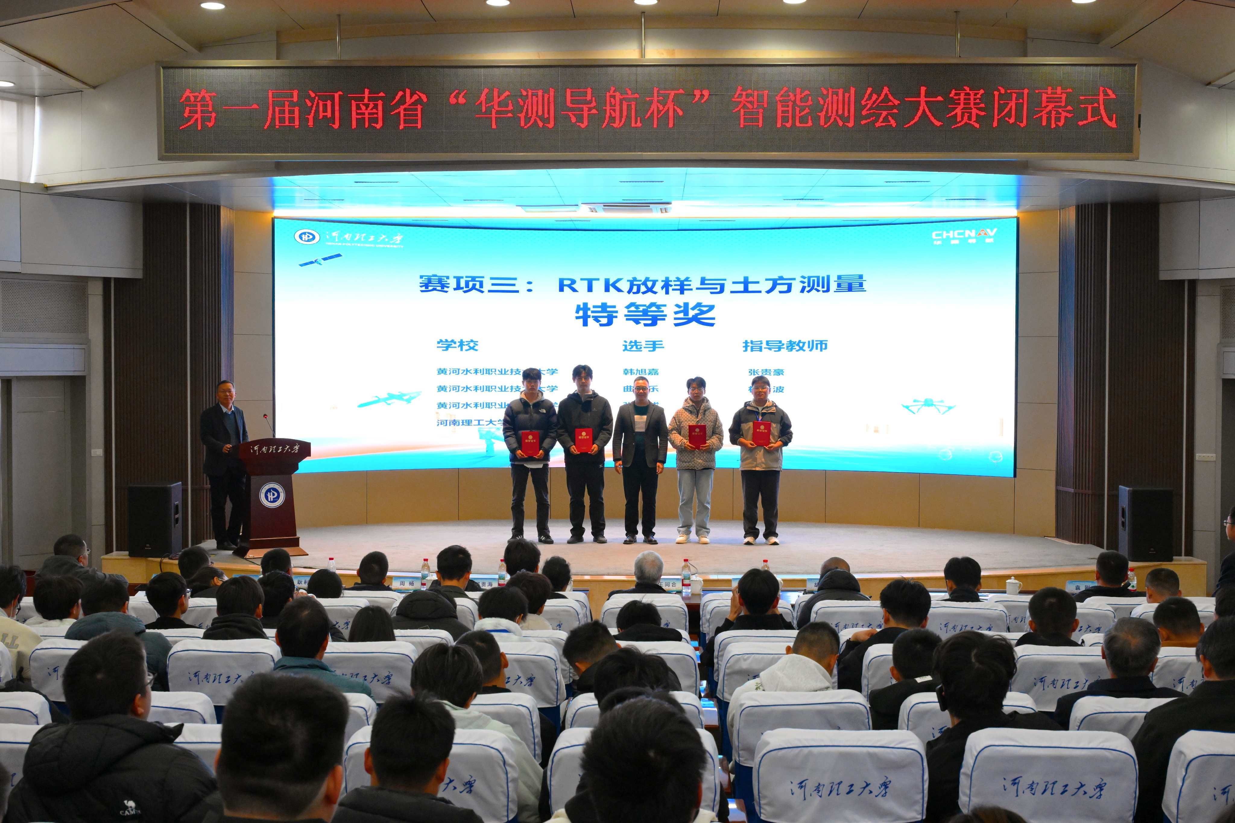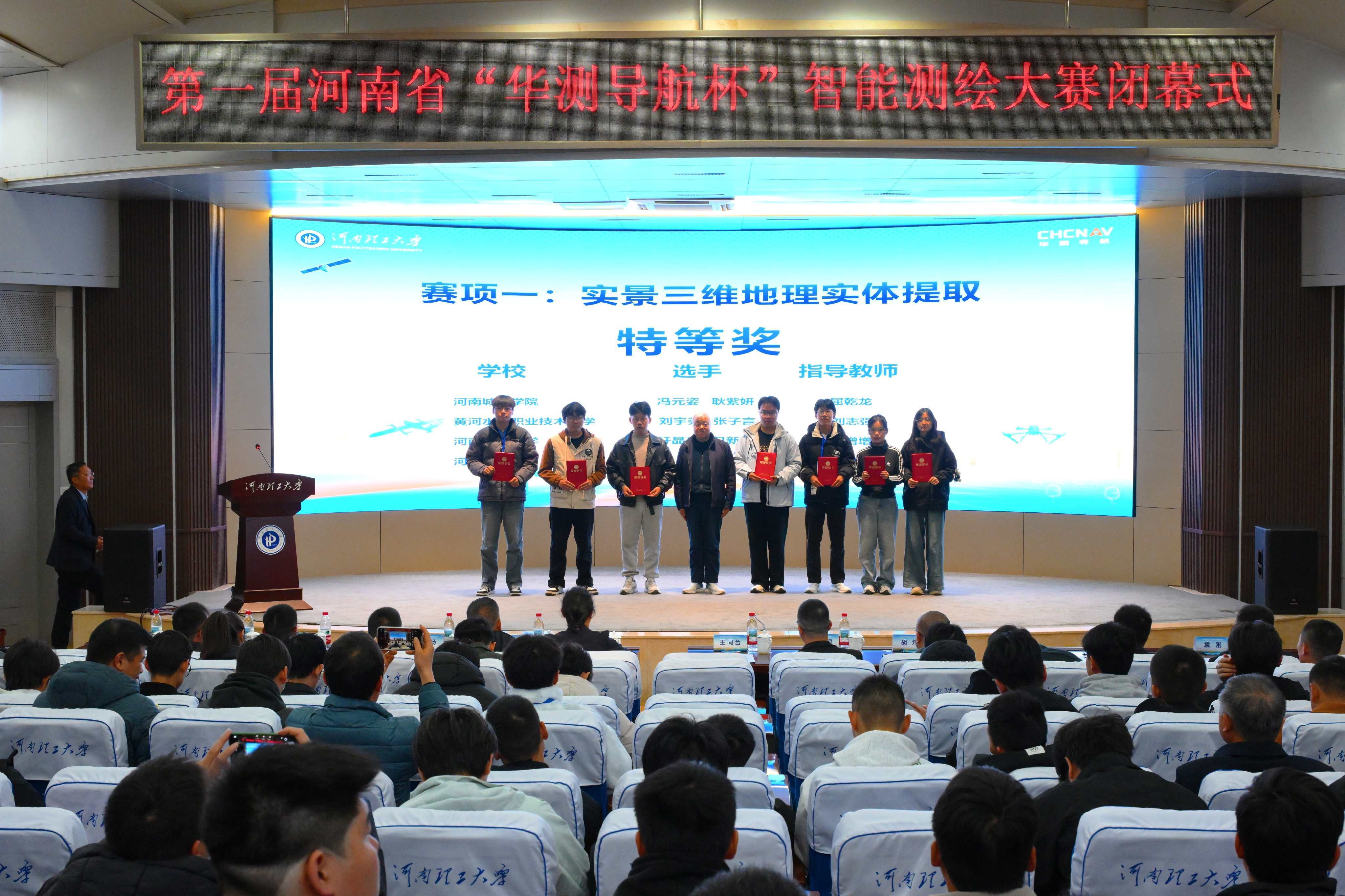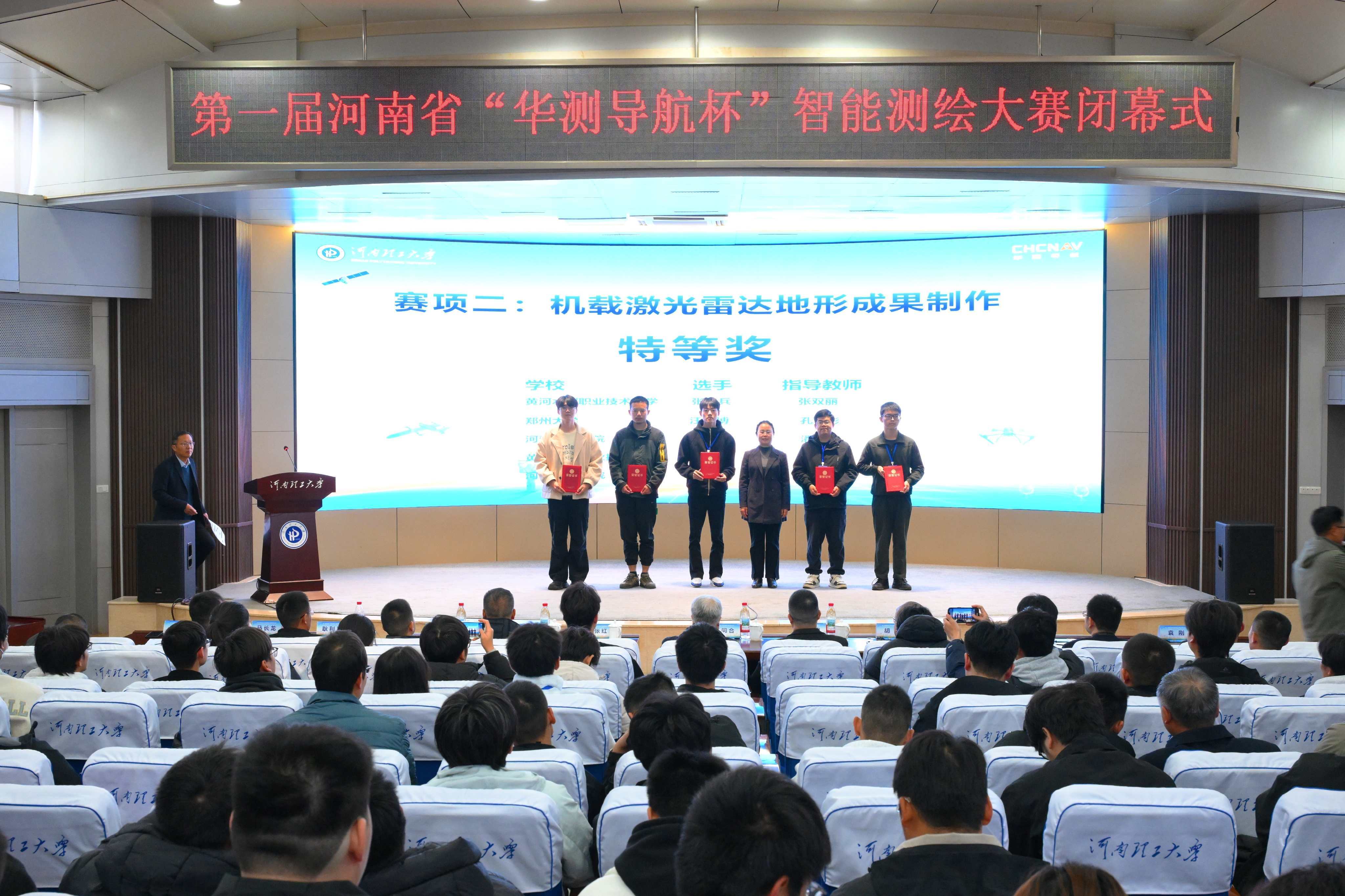 闭幕式上,竞赛总裁判长、中国人民解放军战略支援部队信息工程大学王同合教授宣布比赛结果,周杨教授对比赛情况进行点评。河南省“华测导航杯”智能测绘大赛,为全省测绘学子搭建了高水平的专业实践与交流平台,是深化产教融合、创新育人机制的重要实践,为培养适应新时代需求的高素质测绘人才、推动行业高质量发展注入了强劲动力。