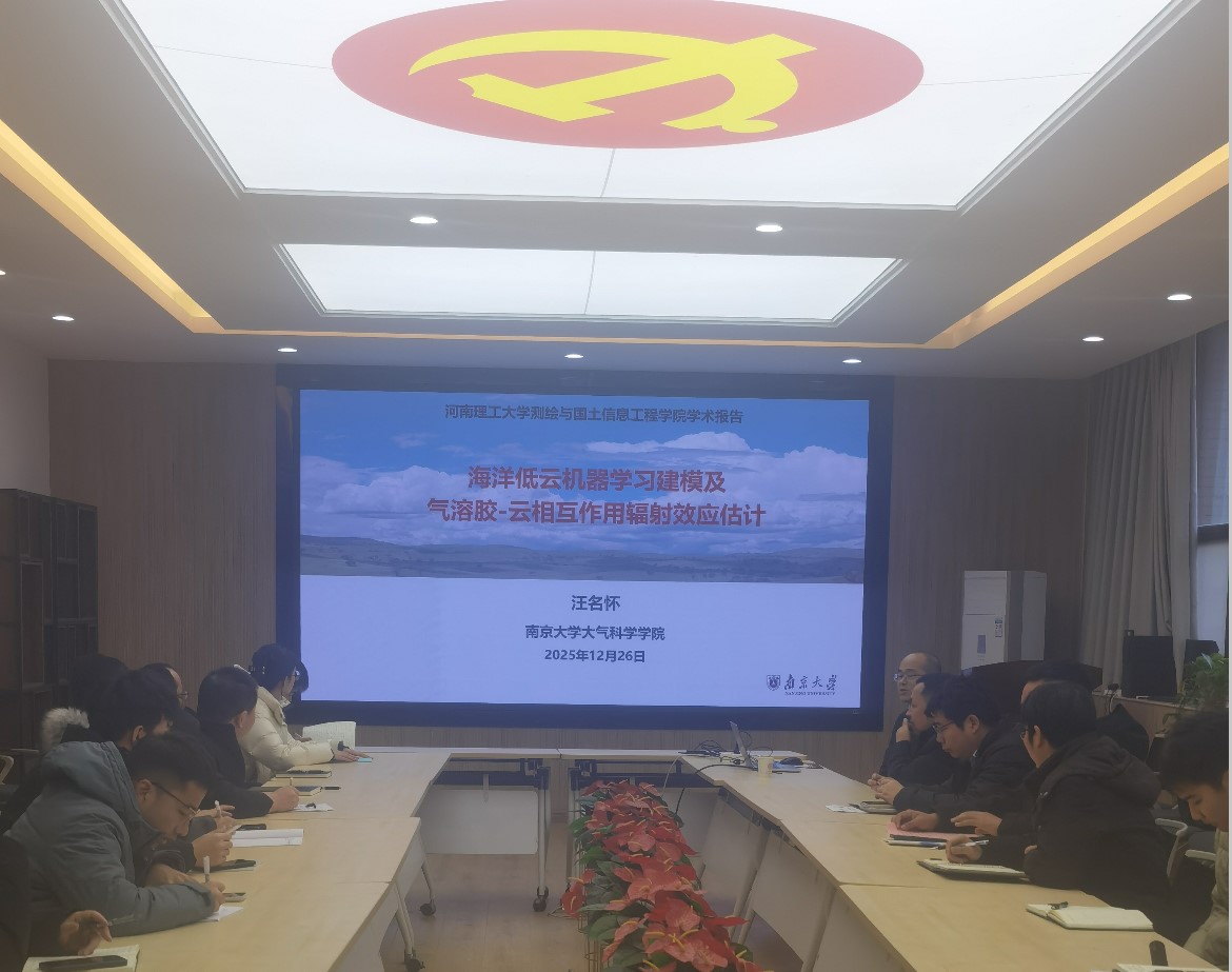 在学科建设、人才培养、科学研究等方面的基本情况。汪名怀教授首先介绍了海洋低云形成和演化的复杂过程、气溶胶-云相互作用、海洋低云在气溶胶-云相互作用和云反馈研究的重要性,然后分享了其团队在海洋低云特性机器学习建模与预测、基于CNN模型估计气溶胶-云相互作用辐射强迫、MODIS卫星漂移对云滴数浓度长期趋势影响等方面的最新研究成果。接着,汪名怀教授分享了基金撰写与申请的经验,并与参会青年教师进行了深入交流与讨论。此次报告为遥感在大气领域的研究提供了新的思路和方法,受到了与会师生的热烈讨论和积极响应。